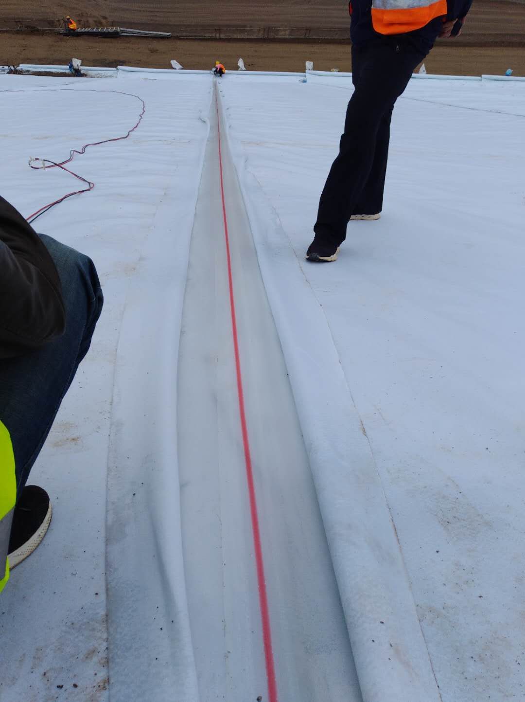 在大型水库和蓄水池施工现场,两个复合土工膜一般重叠10厘米。焊接人员使用双轨热熔焊机进行焊接操作。焊接完成后,监理单位对该焊接接头进行气体压力试验。试验合格后才能进行下一层复合膜的铺设和焊接。如果此焊接接头漏气,则说明焊接不正确,应及时修复。该方法适用于大型油藏和储层。